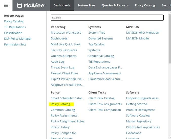 W McAfee ePolicy Orchestrator w celu utworzenia nowej polityki, przejdź do Menu -> Policy Catalog.