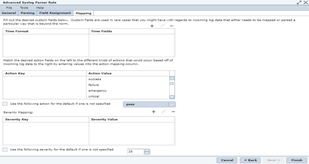 Ostatnia zakładka jest opcjonalna, umożliwia ona doprecyzowanie formatu daty zawartej w pakiecie. Ponadto, w tym miejscu istnieje również możliwość określenia ciągu znaków informujących o efekcie zdarzenia zawartego w logu – przykładowo czy logowanie użytkownika zakończyło się powodzeniem. Istnieje również możliwość uzależnienia istotności zdarzenia od informacji zawartych w pakiecie:
